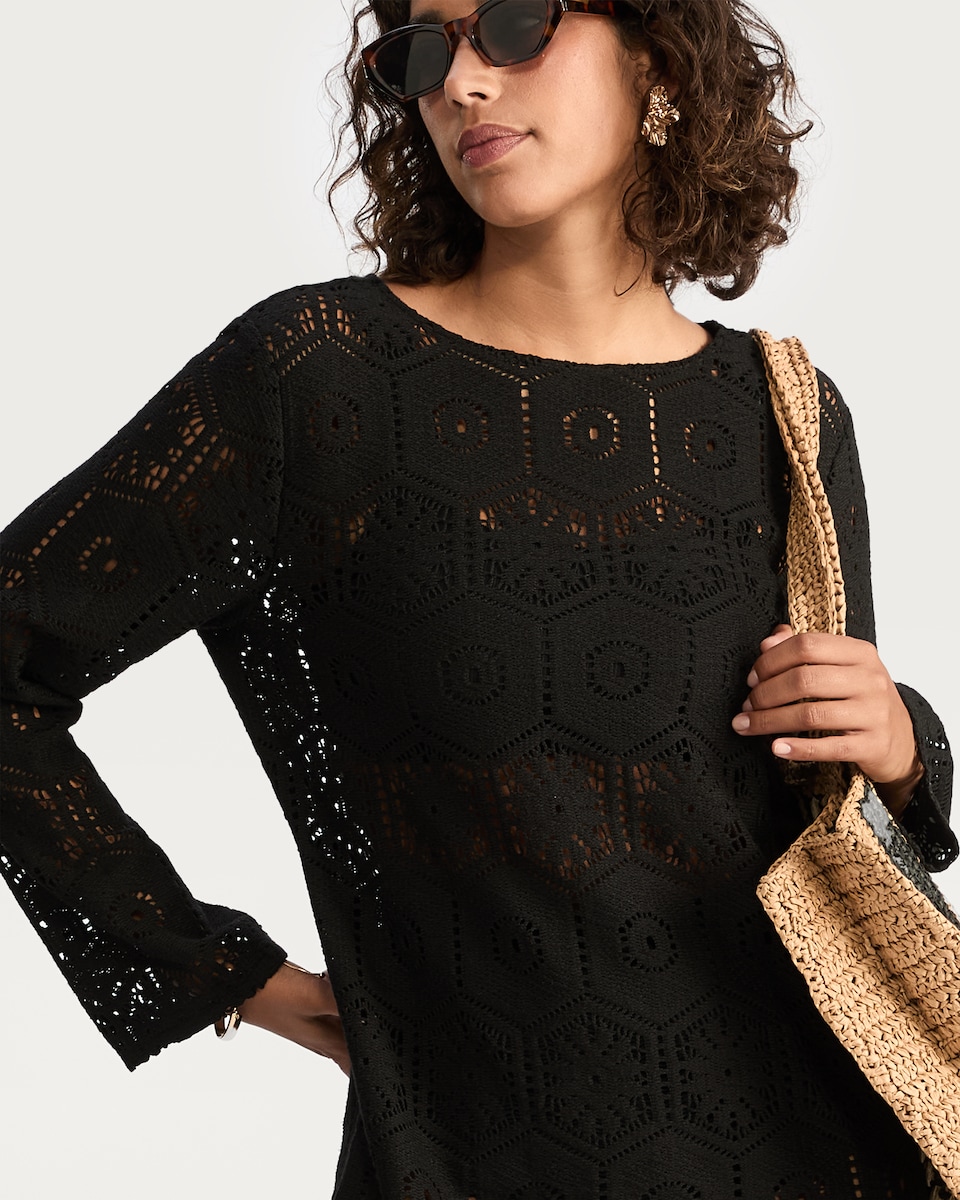 This hexagon pattern crochet look dress features intricate detailing and a delicate openwork design for a romantic feel. Perfect for chic beach days, its mini length, long sleeves, and elegant silhouette make it the perfect piece to throw over your bikini. Pair with sandals and your favourite sunglasses for an on-trend look.